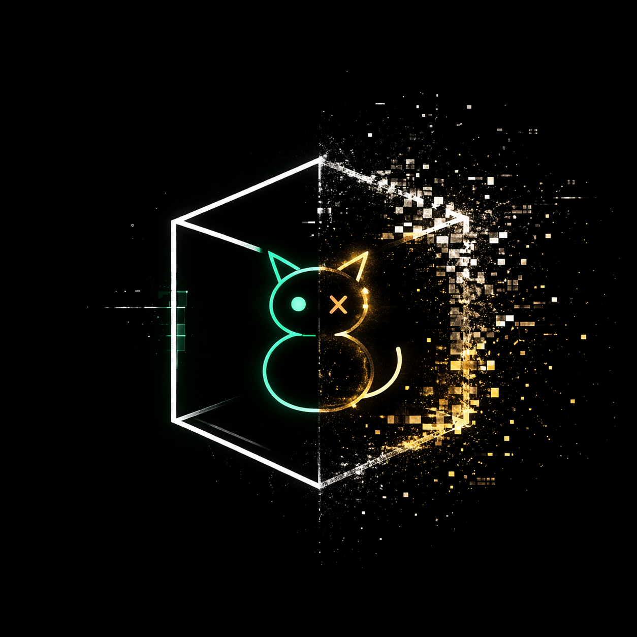 Ψ = α|ALIVE⟩ + β|DEAD⟩ · |α|² + |β|² = 1